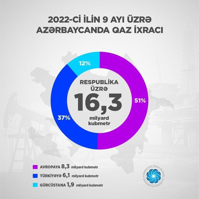 BAKU, Azerbaijan, October 14. Azerbaijan exported 8.2 billion cubic meters of gas to Europe from January through September 2022, Trend reports via Minister of Energy of Azerbaijan Parviz Shahbazov's Twitter.