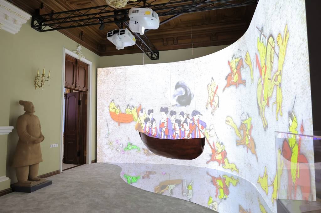 The first hall of the exposition is called “Nature Paintings of China and Uzbekistan”. It presents an installation of products made of silk, as well as animated scenes based on the wall paintings of Afrasiab. Archaeological finds and objects are reflecting the culture of China in the pre-Islamic period.